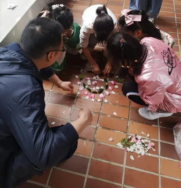 华农科普讲师团团长胡勇带领孩子们用花瓣和树叶开展创意游戏